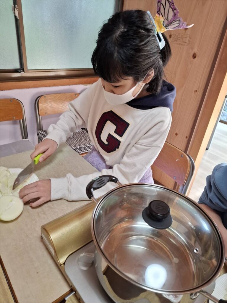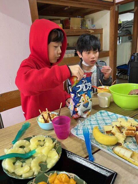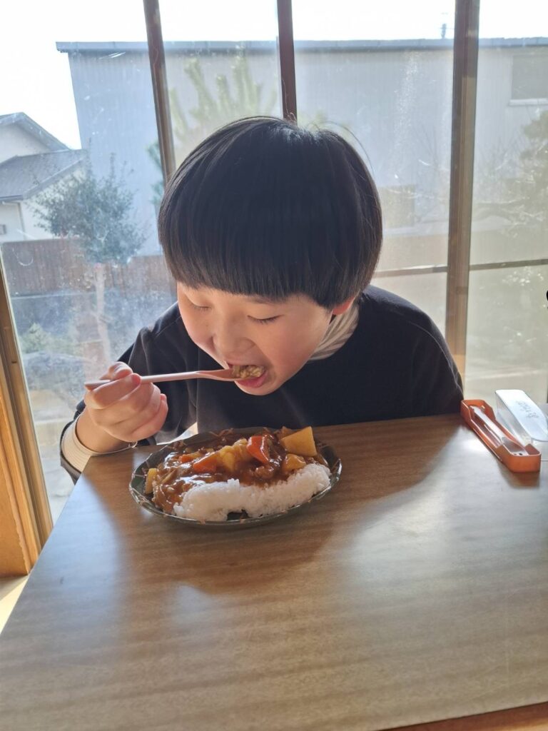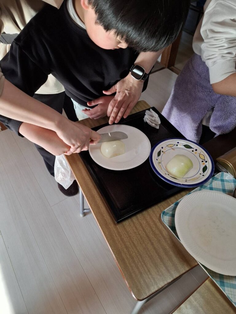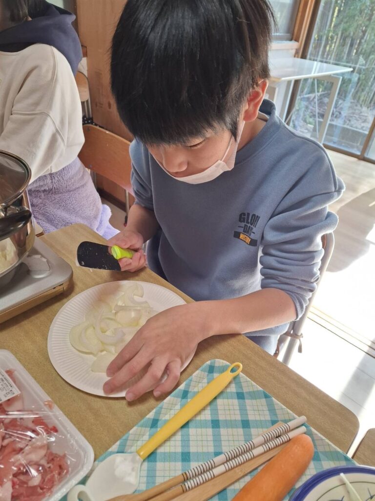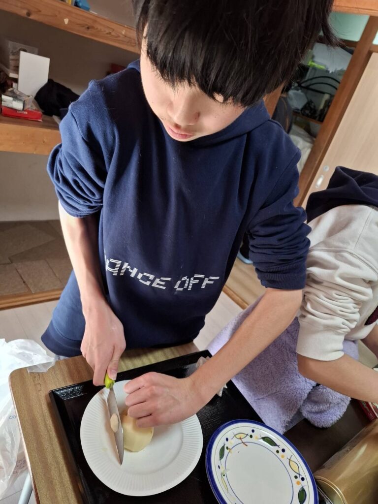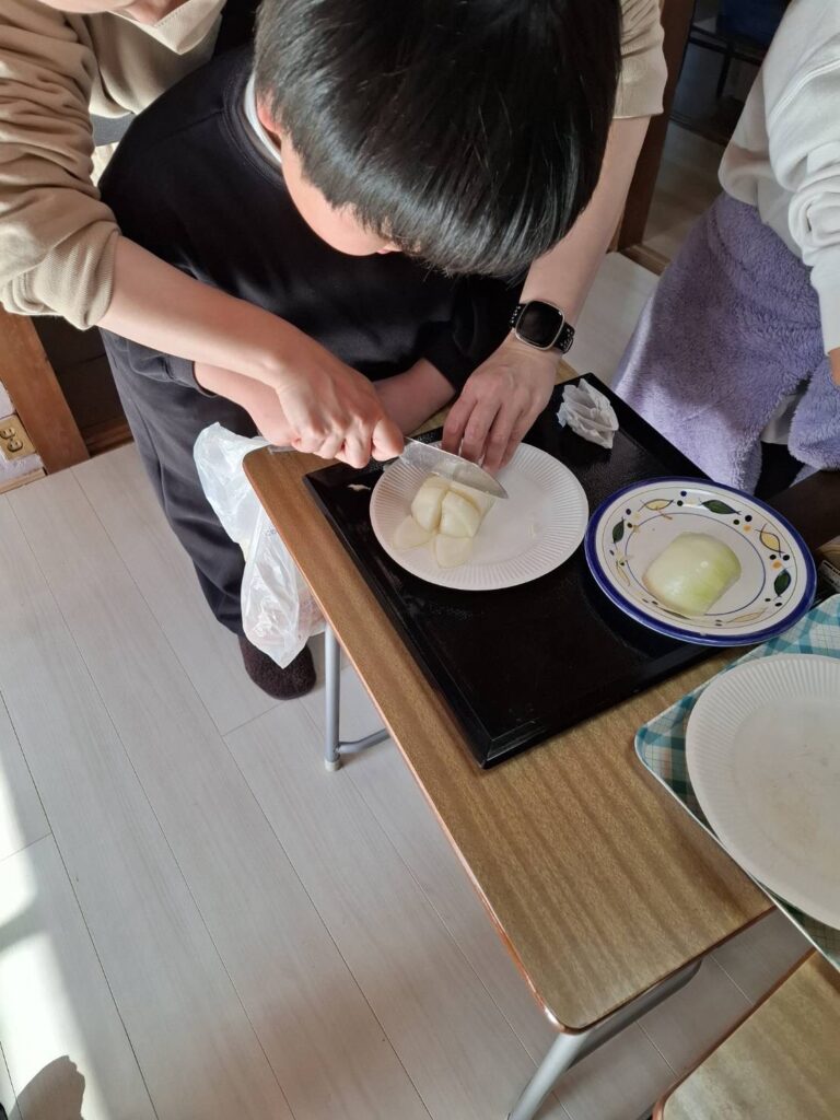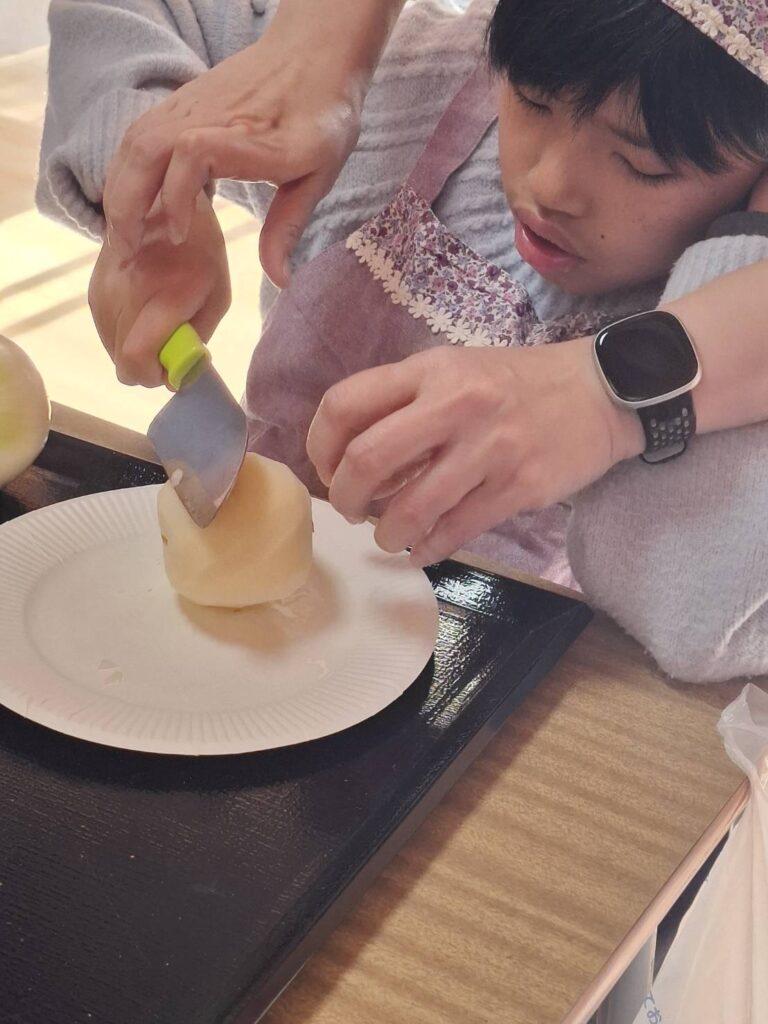 冬休みにカレー作りやお菓子パーティーをしました。カレー作りでは、野菜を洗ったり、皮をむいたり、野菜を切ったり、お鍋に野菜を入れるなど、職員と一緒に楽しんで作ることができました。サラダも作りました。お菓子パーティーでは好きなお菓子や果物をたくさんのせてホイップクリームもつけたりしていただきました。