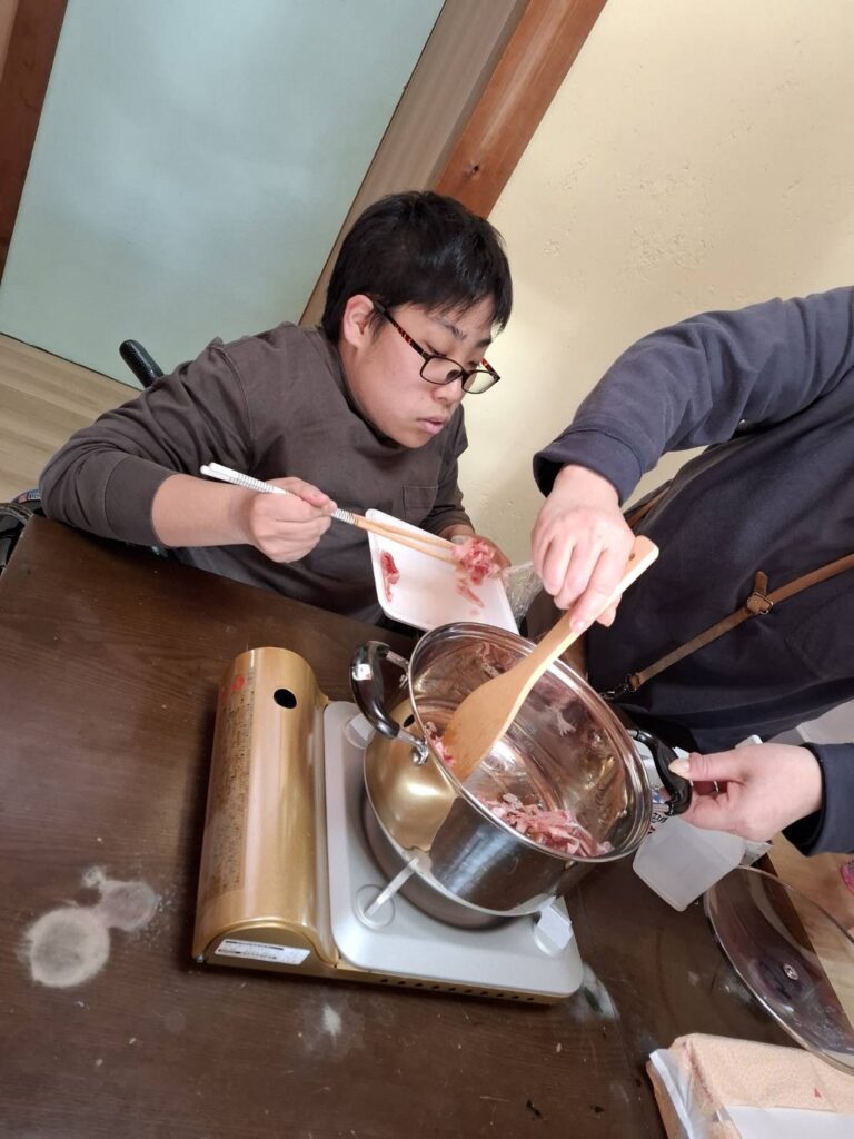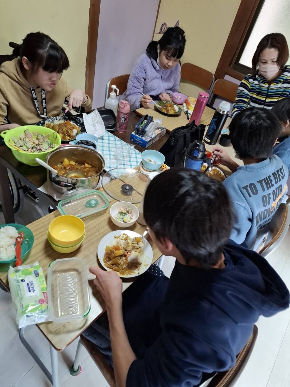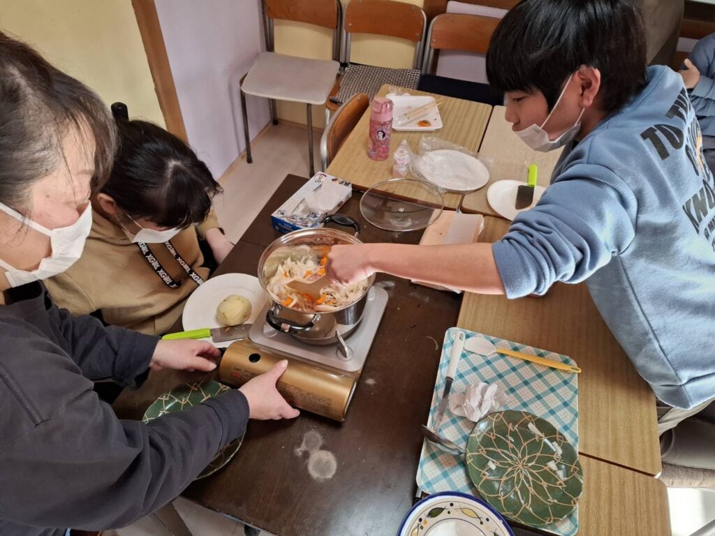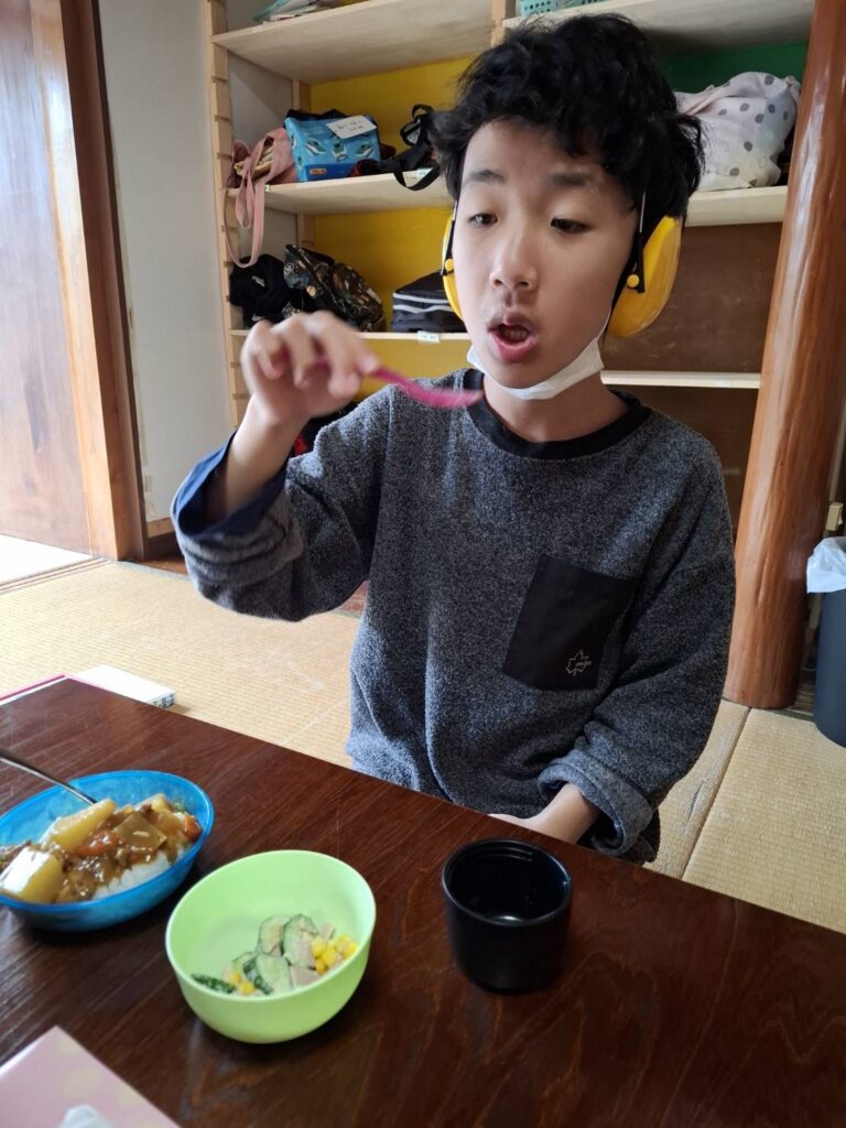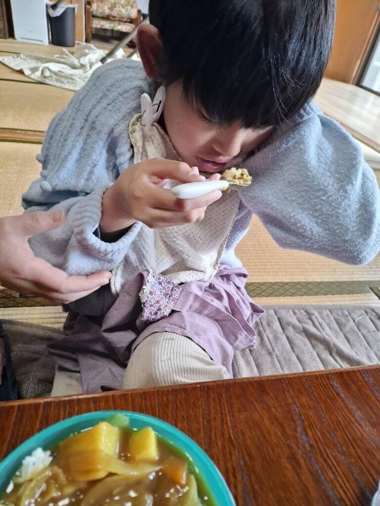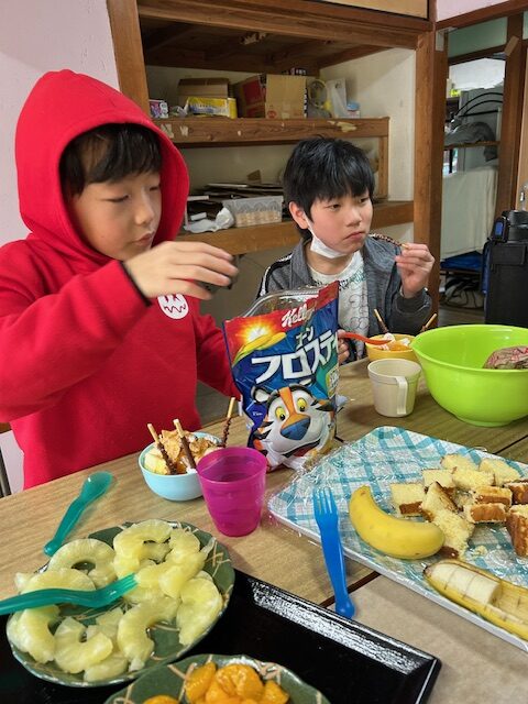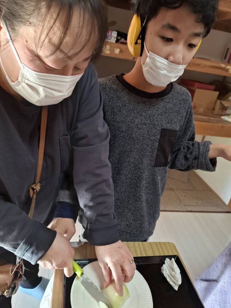 冬休みにカレー作りやお菓子パーティーをしました。カレー作りでは、野菜を洗ったり、皮をむいたり、野菜を切ったり、お鍋に野菜を入れるなど、職員と一緒に楽しんで作ることができました。サラダも作りました。お菓子パーティーでは好きなお菓子や果物をたくさんのせてホイップクリームもつけたりしていただきました。