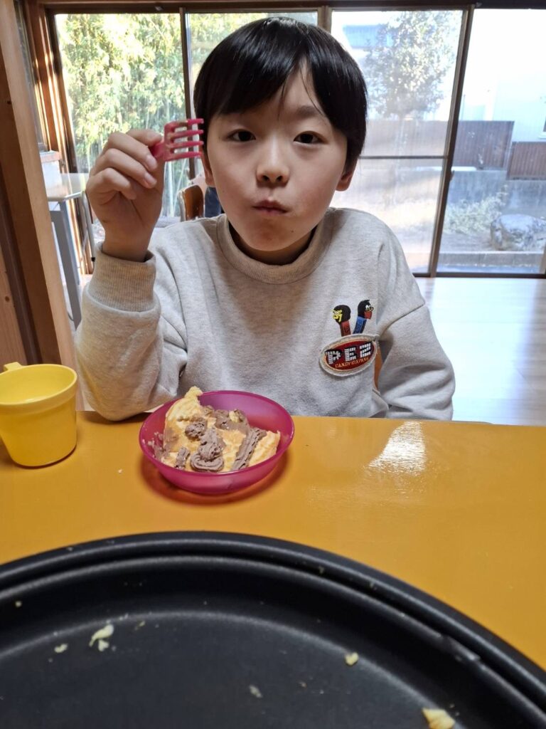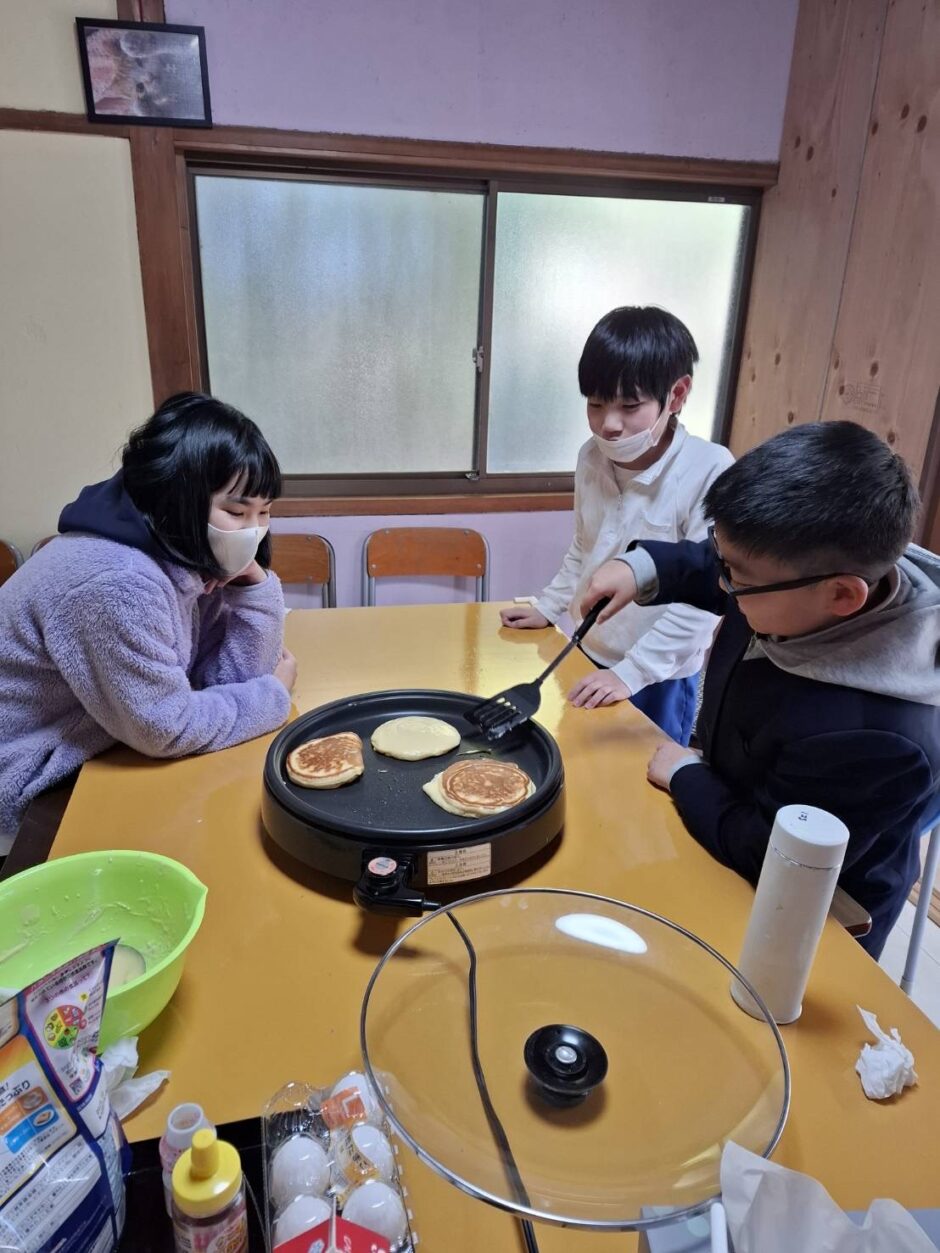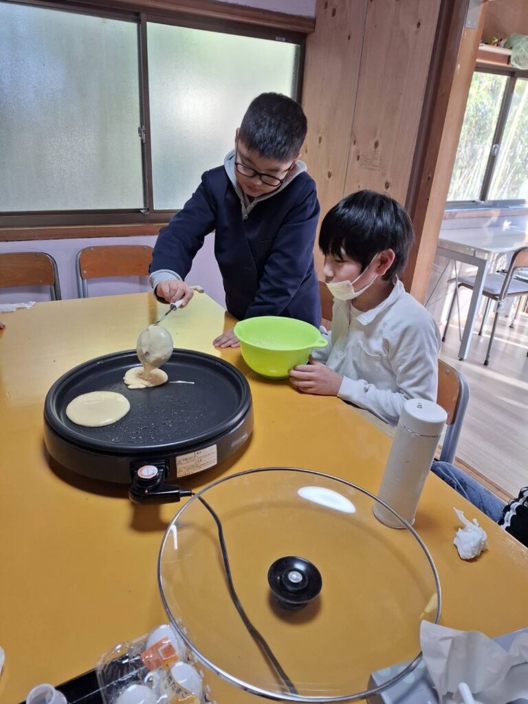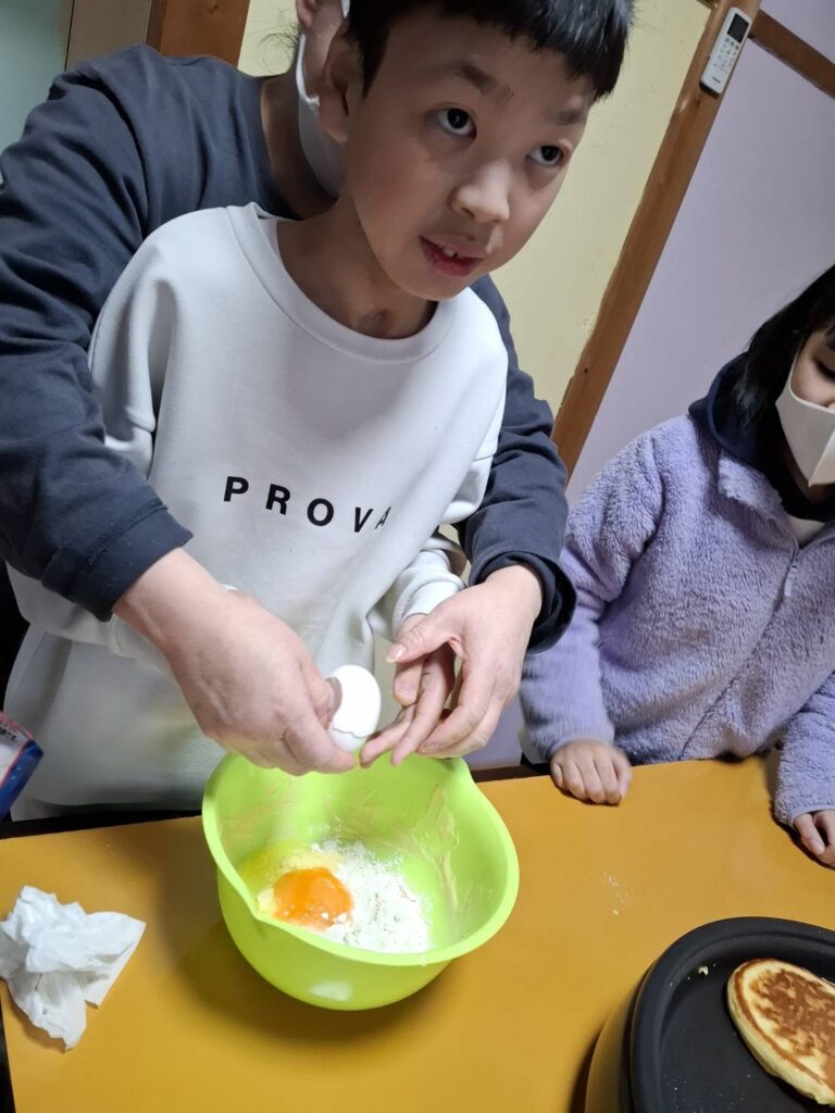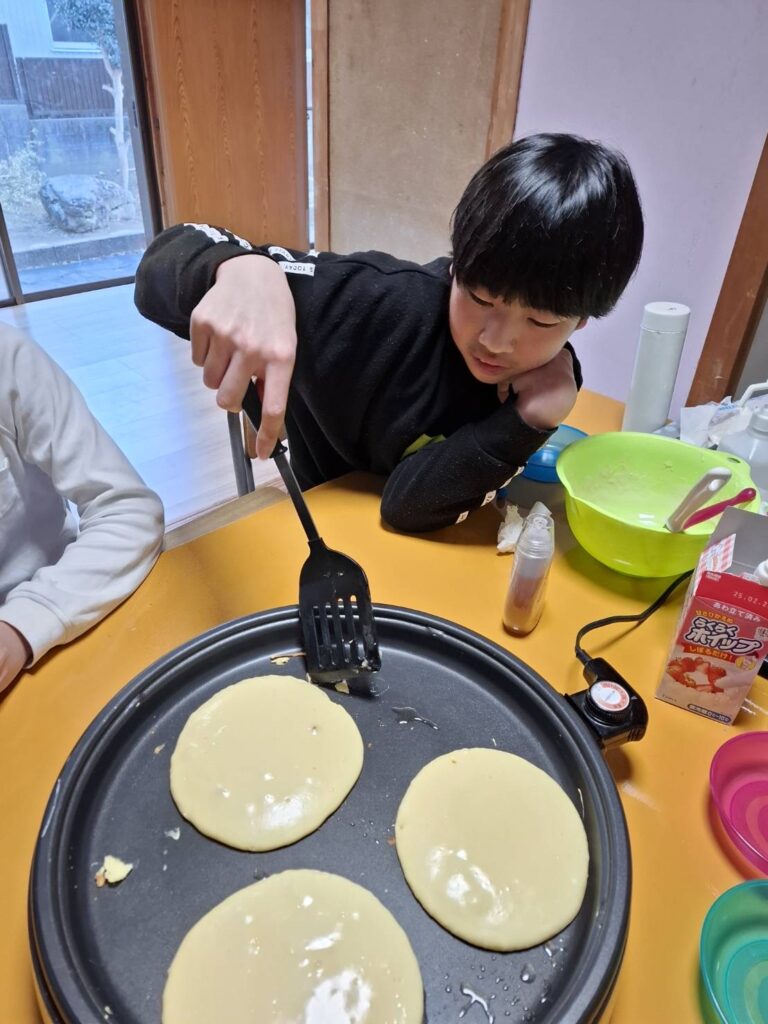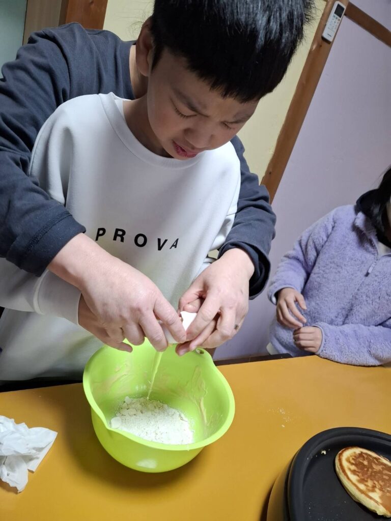 ホームダイアリー ホットケーキ 2025年1月22日 おやつ作りをしました。ホットケーキを焼きました。自分で卵を割ったり、生地を入れたり、裏返したり♪自分達で焼くホットケーキはとても美味しかったようです。