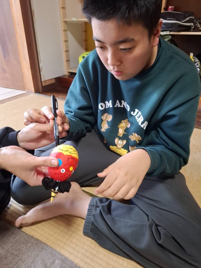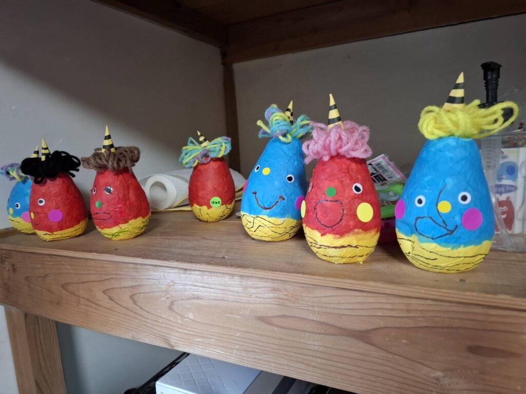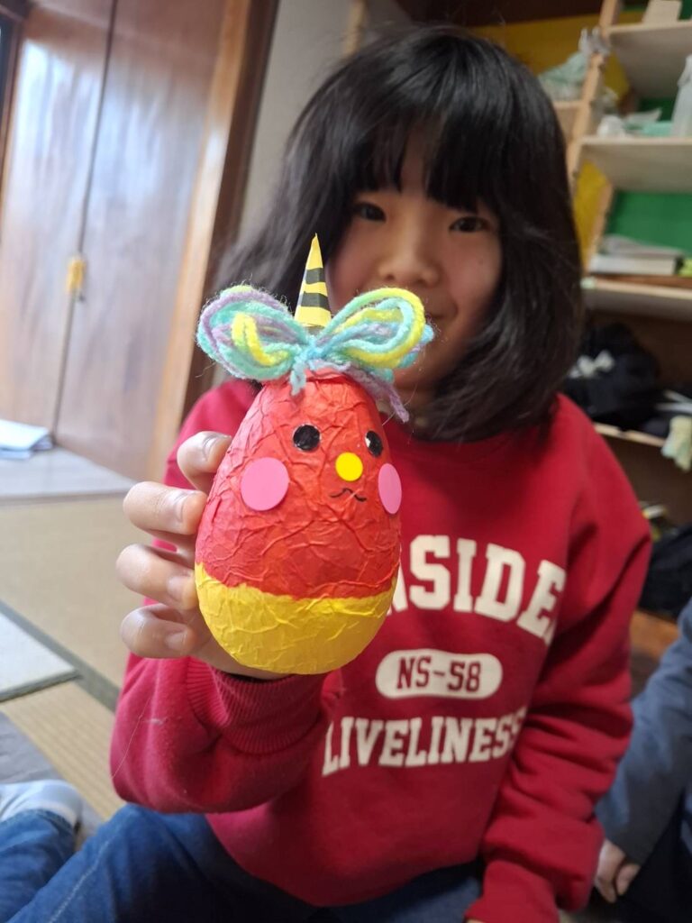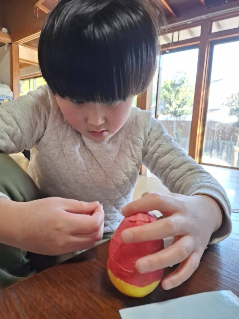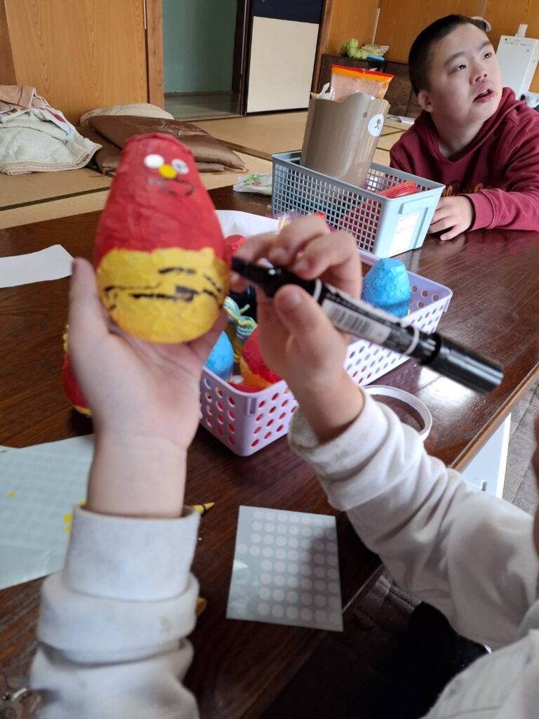 職員が作った張子に顔や模様をつけました。「かわいいな♡」「家に飾る!」と仕上がりの可愛さに職員共に喜びました。鬼のパンツに模様を描く子、ほっぺにピンクのシールを貼る子など一つ一つの作品に個性が出ていました。かわいい作品がたくさんできました。