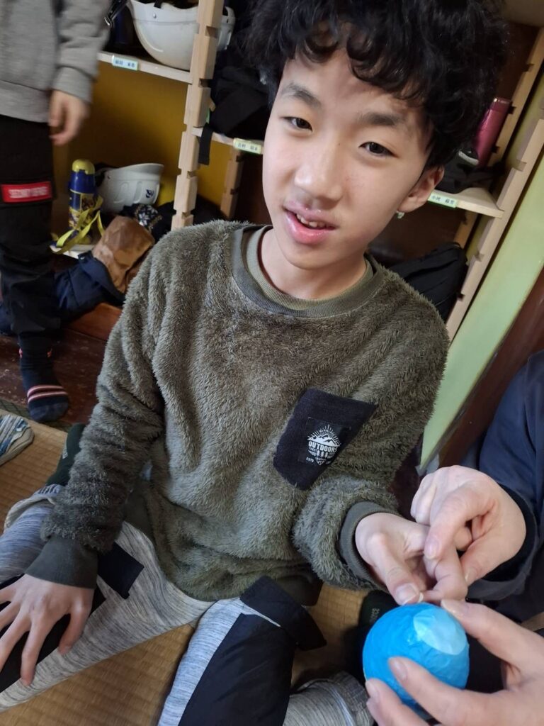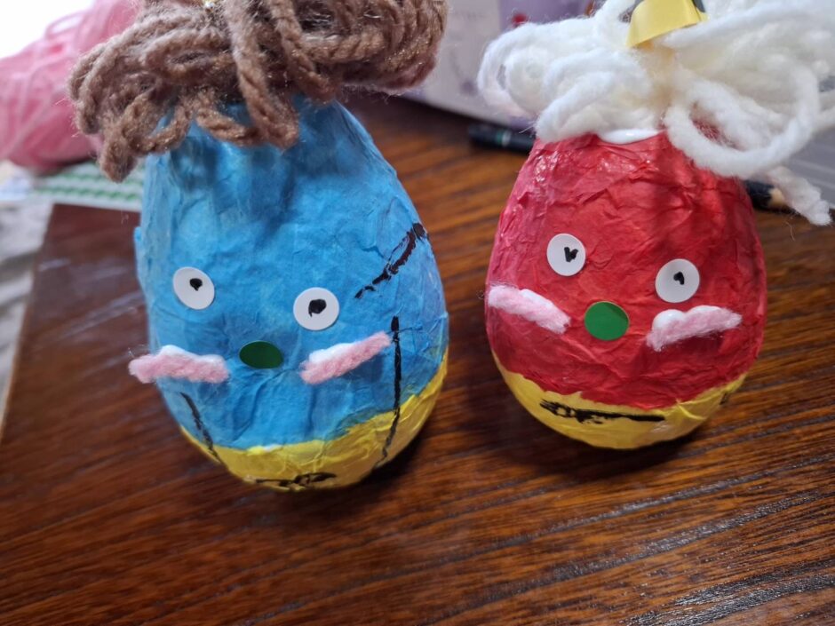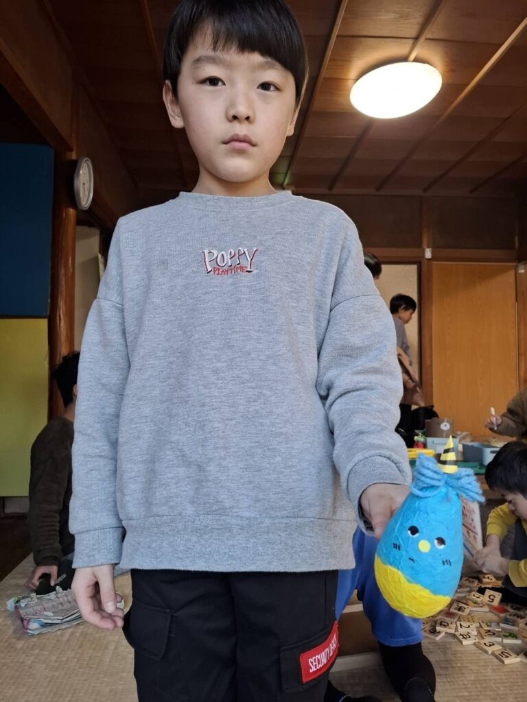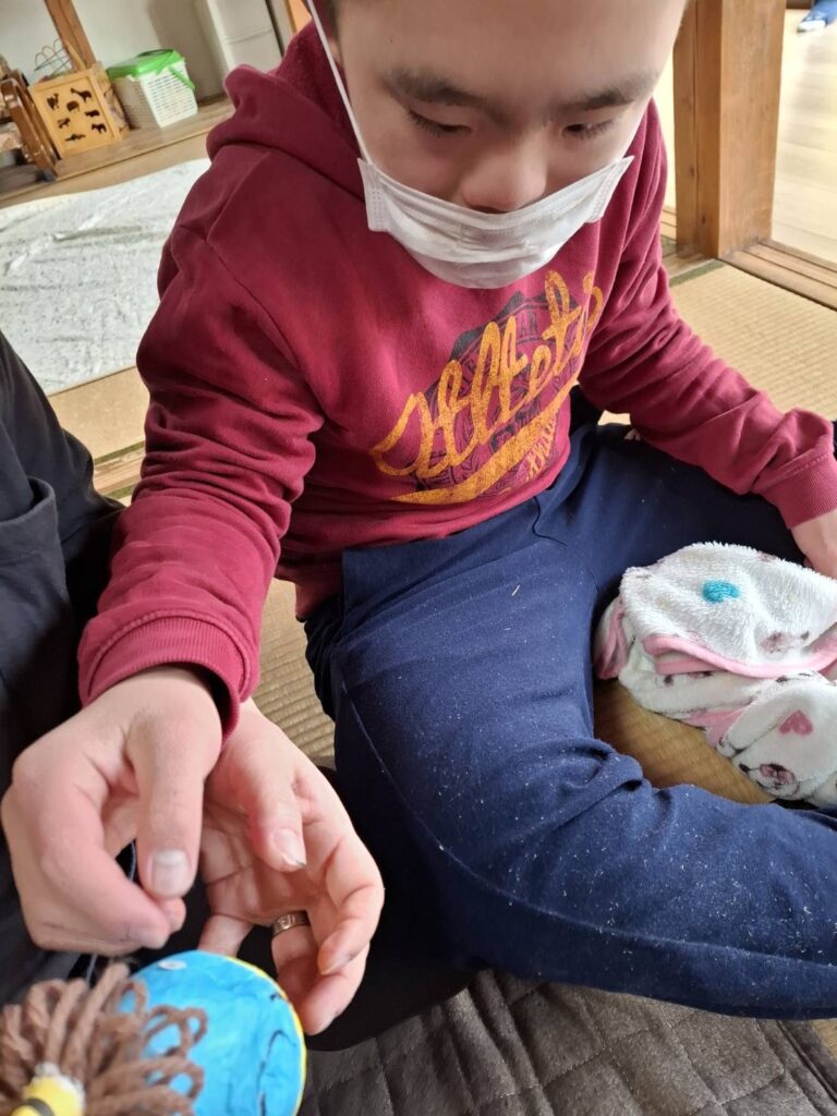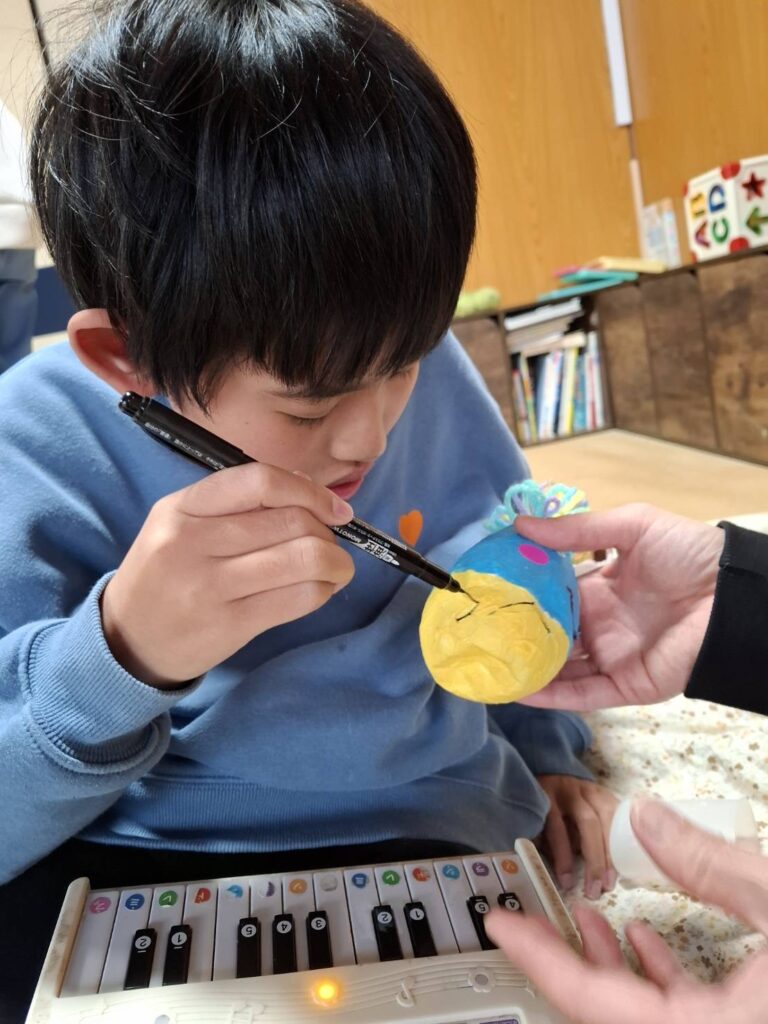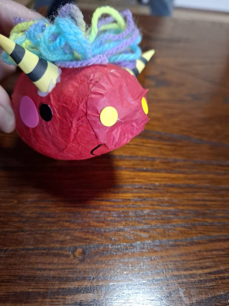 職員が作った張子に顔や模様をつけました。「かわいいな♡」「家に飾る!」と仕上がりの可愛さに職員共に喜びました。鬼のパンツに模様を描く子、ほっぺにピンクのシールを貼る子など一つ一つの作品に個性が出ていました。かわいい作品がたくさんできました。
