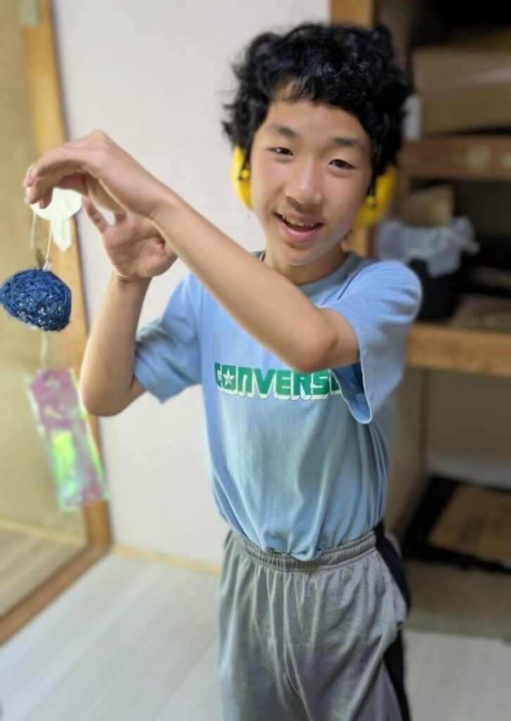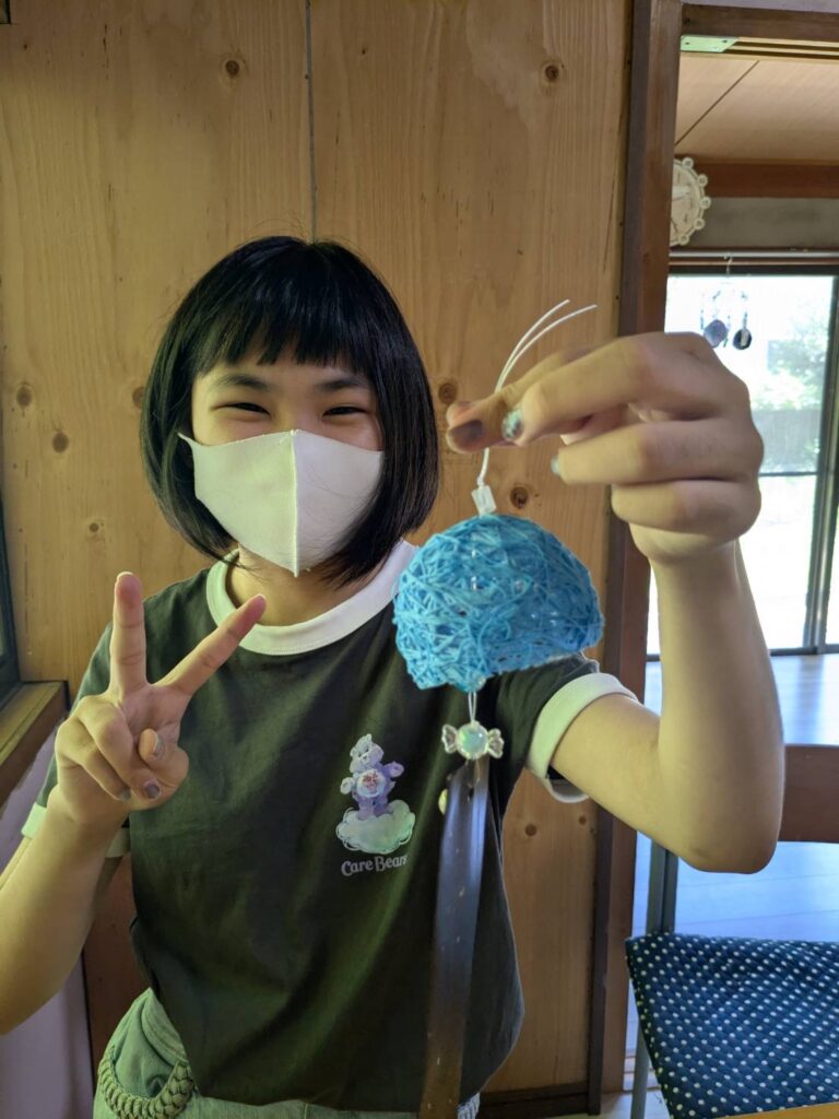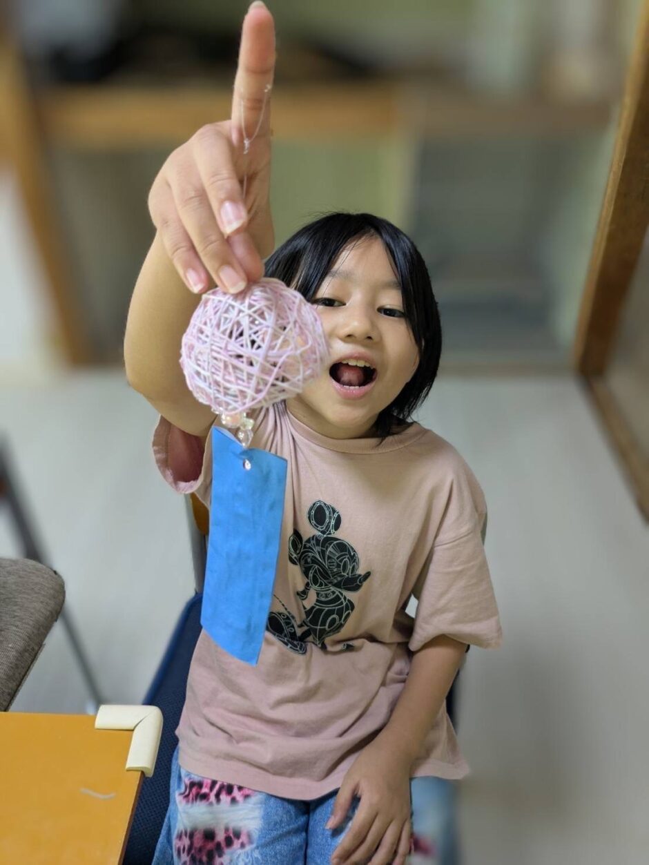 ホームダイアリー 風鈴作り 2025年8月18日 みんなで風鈴を作りました。風鈴の本体は、水風船を膨らませ、その上に糸を巻きつけ、ボンドと水を1:1で混ぜたものを塗り、乾かせた後、風鈴の形に切りました。とても可愛らしいふうりんができあがりました。鈴がついているので短冊に風が当たるといい音がします。