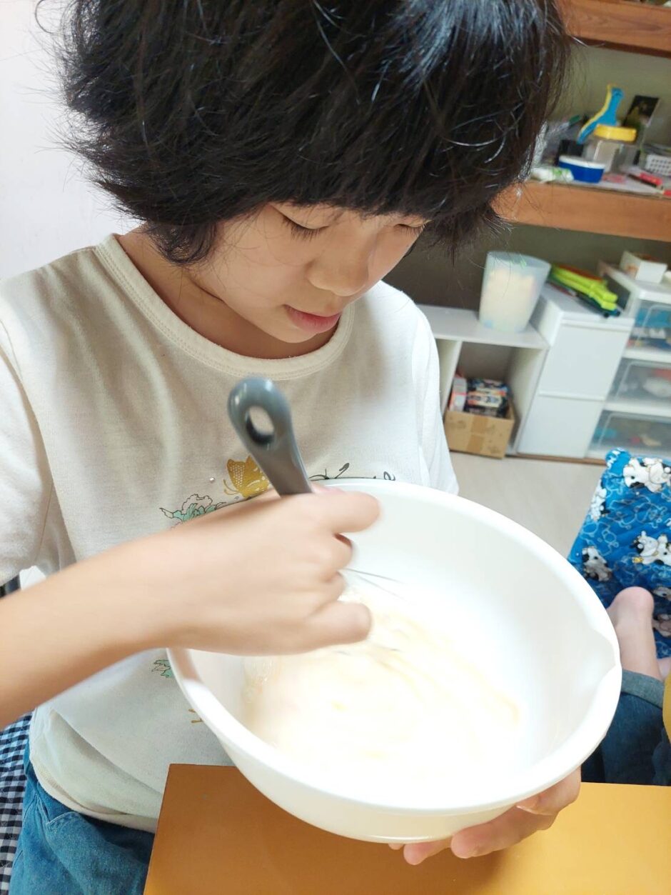 「プールが終わったら、久しぶりにホットケーキ作りしよっか♪」とみんなに声をかけると、「やったぁ!」と嬉しそうな子どもたち。午前中に夏休みの宿題を頑張って…美味しいお弁当を食べて…午後からプールをして…ホットケーキ作り。いつもは、声をかけても「まだプール出やん!」となかなか出ない子も、今日は声をかけると「はーい!」とすぐに出てきてくれました(笑)みんなで分担して準備をし、美味しいホットケーキが完成しました♪